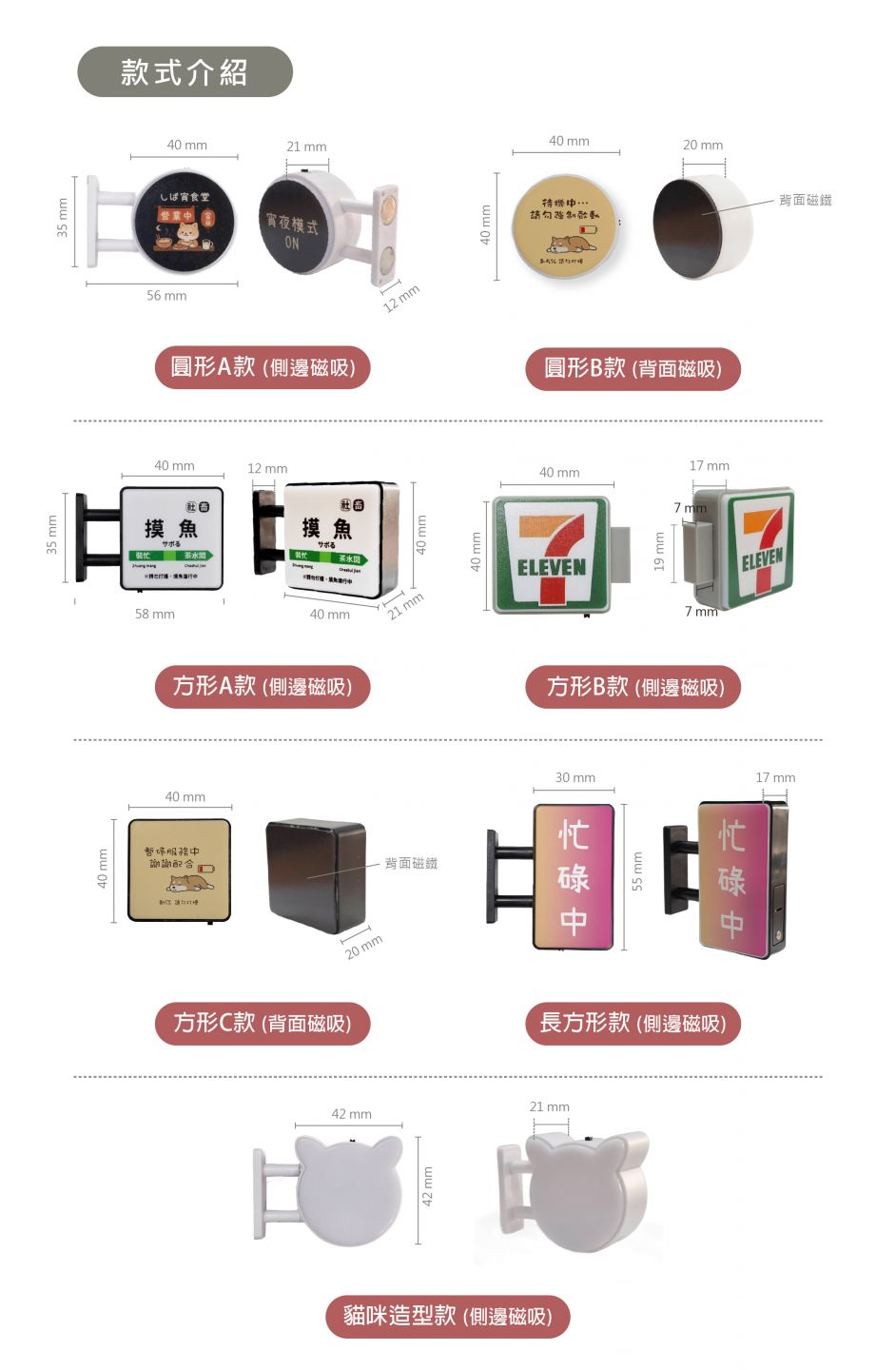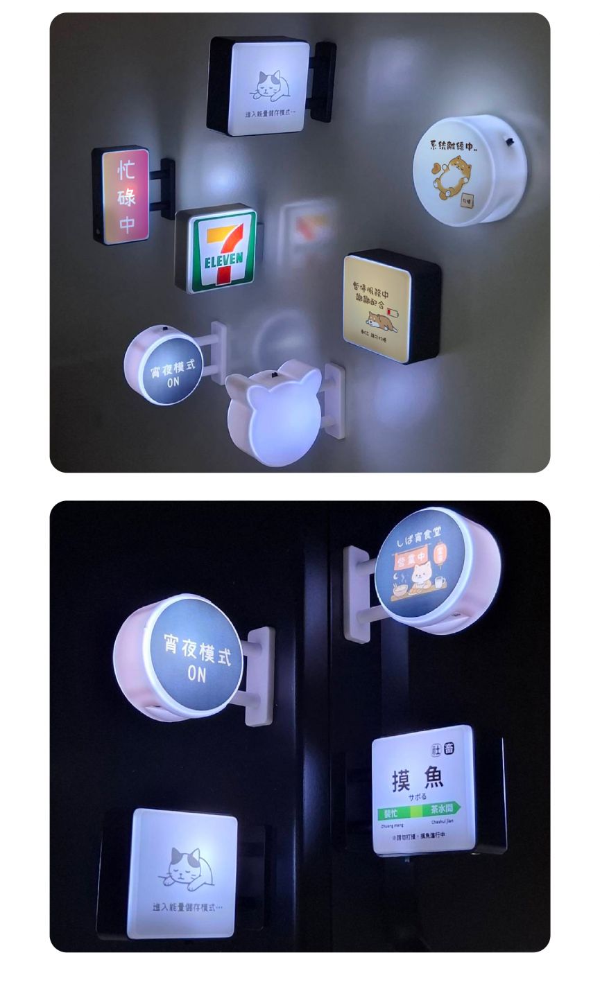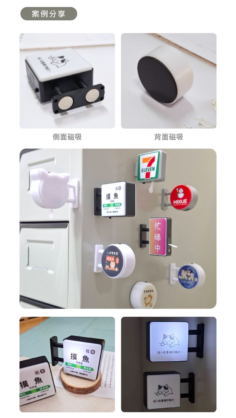 小燈箱有圓形、方形、長方形、貓咪造型等多種款式可選擇,上面可印刷彩色LOGO,燈座配有磁鐵可吸附於冰箱或鐵製物品上,燈座顏色有黑色、白色、灰色可選擇,小燈箱有配置LED開關可發光。